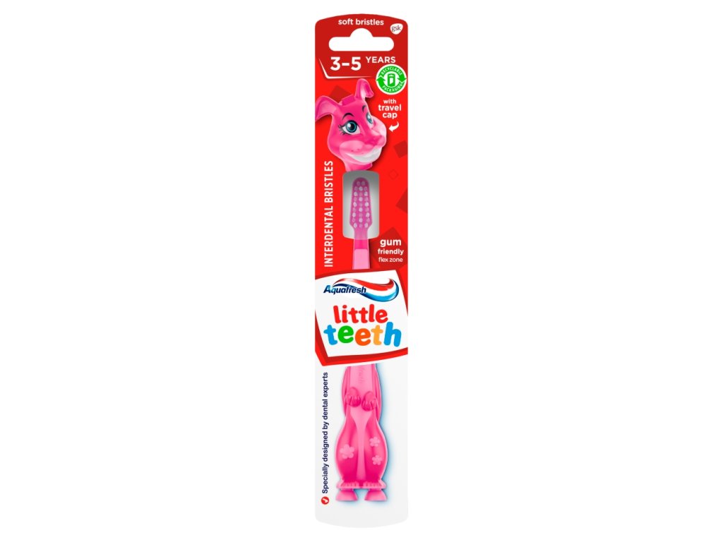 Az Aquafresh Little Teeth Soft fogkefe puha sörtéjű gyermekek számára készült fogkefe. A fogkefe védi a tejfogakat és megelőzi a fogszuvasodást. A szállítás az aktuális ajánlattól függ, és nem lehetséges konkrét motívum szállítása. Az Aquafresh Little Teeth Soft gyermek fogkefe jellemzői: 3-5 éves gyermekek számára készült. Puha sörtéi eltávolítják az ételmaradékokat és a foglepedéket. Rugalmas nyaka nem nyomást gyakorol a gyermekek ínyére. Így védve van az irritációtól vagy a mechanikai sérülésektől. A fogkefét három havonta ajánlott cserélni. Az Aquafresh Little Teeth fogkefe használata: A fogkefe nyakának túlzott/túlzott hajlítása a nyak törését okozhatja. A 6 év alatti gyermekeknek felnőtt felügyelete mellett kell fogat mosniuk. Ne engedje, hogy a gyermekek rágják a sörtéket vagy a fogkefét. Ne vegye a kefevédőt a szájába. A fogkefét 3 havonta ajánlott cserélni.