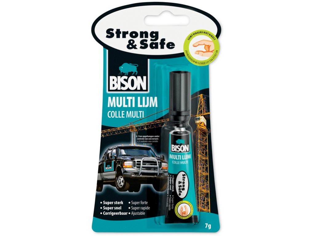 BISON ERŐS ÉS BIZTONSÁGOS ERŐS, AMI MÉG EGY TEHERAUTÓT IS BIZTOSÍT Gyors és erős. Rugalmas és átlátszó. Lehetőséget ad a hézag korrigálására. Szabadalmaztatott összetételű. Biztonságos - nincs veszélye az ujjak azonnali beszorulásának. Irritáló gőzök nélkül. TERMÉKLEÍRÁS: A harmadik évezred univerzális ragasztója. Szinte minden rugalmas, erős, porózus és nem porózus anyaghoz. Nagyon erős, gyors és biztonságos kötés, 20-30 másodperces korrekciós lehetőséggel. A ragasztó rezgés- és ütésálló, ellenáll az időjárási viszonyoknak és a -50°C és +100°C közötti hőmérsékletnek, rugalmas, átlátszó és szagtalan. Végső kötési szilárdság legalább 50 kg/cm2. FELHASZNÁLÁSI TERÜLET: Alkalmas minden rugalmas, merev, porózus és nem porózus anyag, például porcelán, kerámia, különféle műanyagok, fémek, fa, üveg, bőr, gumi, polisztirol hab, papír, karton és egyéb anyagok ragasztására.* HASZNÁLATI UTASÍTÁS: A felületeknek tisztának, száraznak, por- és zsírmentesnek kell lenniük. Vigye fel a ragasztót az egyik ragasztott felületre (minél kevesebb, annál jobb – ne vigye túlzásba). Azonnal illessze össze az alkatrészeket, és nyomja őket erősen 30-60 másodpercig. Normál használat esetén 1-3 perc kötési idő elegendő. Teljes kötési idő: 12 óra. A meg nem száradt foltokat azonnal távolítsa el textil kendővel – ne papírral. TIPP: Szabadalmaztatott összetételének köszönhetően nem képez fátylat átlátszó anyagokon. Pl. műanyag modellkabinokon stb. *Nem alkalmas PP, PE, teflon, szilikon és textíliák ragasztására.Kiegészítő paraméterek