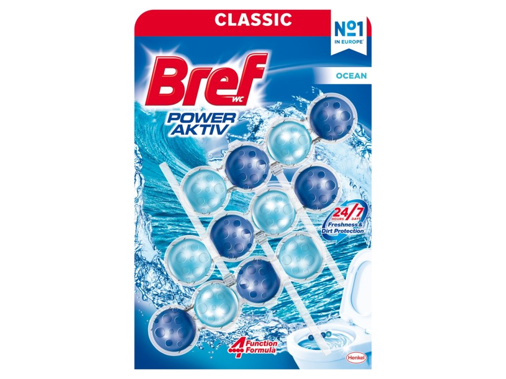 A Bref Power Aktiv Ocean WC-tisztító blokk innovatív módja a WC karbantartásának. A WC-tisztító blokk négy golyóval van felszerelve, amelyek mindegyike speciális összetételű a tökéletes eredmény érdekében. Minden öblítéssel a WC friss és higiénikusan tiszta lesz.