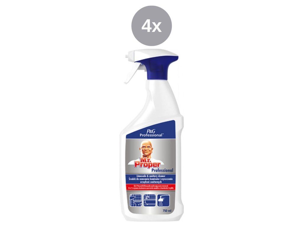 A Mr. Proper Professional vízkőoldó és szanitertisztító spray formájában használatra kész. Tiszta és kezelt felületeket hagy maga után, így azok hosszú ideig fényesek maradnak . A hatékony polimer rendszer láthatatlan védőréteget képez a felületen, amely hosszan tartó fényt biztosít. A savas pH-jú formula segít megelőzni a vízkőképződést .