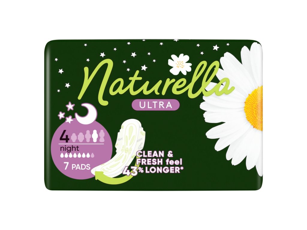 A Naturella Ultra Night kamillabetétek szárnyakkal a helyükön tartják őket, gyengédek és védelmet nyújtanak a nehéz éjszakák során. Ezek az egyetlen női higiéniai termékek, amelyek Dermacremet tartalmaznak, egy egyedülálló, száraz bőrre védő krémet, amely klinikailag bizonyítottan segít megelőzni a bőrirritációt. Ezek a Naturella Ultra Night betétek 2 mm vékonyak, kamilla illatúak és exkluzív virágos nedvszívó rendszerrel rendelkeznek. Emellett kiváló nedvszívó képességű gélgyöngyöket is tartalmaznak, amelyek elvezetik a folyadékot a bőrről, így egész éjjel száraz és kényelmes érzetet biztosítanak.