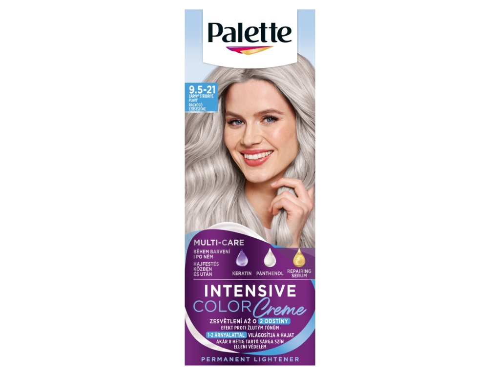 Palette Intensive Color Creme hármas ápolórendszerrel a hosszan tartó és intenzív színeredményért. Az intenzív pigmenteket tartalmazó formula mélyen behatol a hajba, rögzíti a színt, így véd a fakulástól. Az eredmény több hétig tartó, intenzitású szín és akár 2 árnyalattal világosító hatás. A keratint, pantenolt és nutri-olayt tartalmazó hármas ápolórendszernek köszönhetően ápolja a hajat festés közben és után, és puha tapintásúvá teszi.