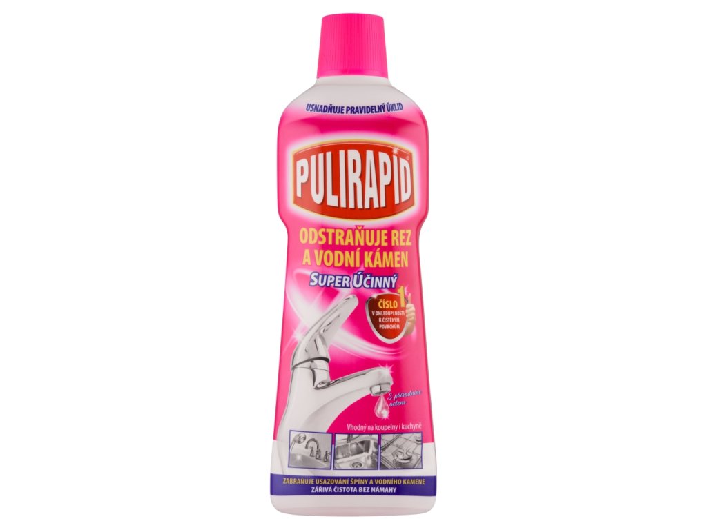 A Pulirapid Aceto fényesre tisztít, és eltávolítja a vízkövet , a szappanlerakódásokat és a rozsdát a konyhában, a fürdőszobában és nagy felületeken.