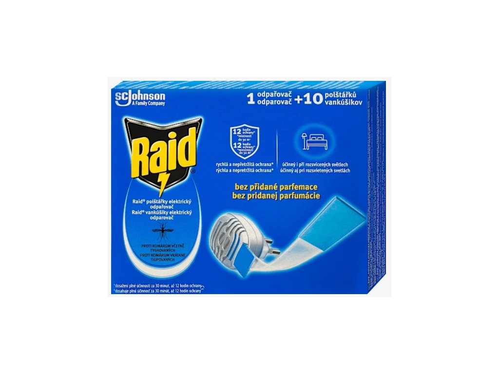A Raid elektromos párologtató megbízható és gyors védelmet nyújt a szúnyogok és más kisebb repülő rovarok ellen. Biociddal átitatott száraz párnát használ utántöltőként (a csomag 10 darabot tartalmaz), amelyet egyszerűen be kell helyezni a riasztóba, majd a készüléket be kell dugni a konnektorba. Egy utántöltő akár 12 órán át is hatékony, és enyhén nyitott ablak vagy égő lámpa mellett is működik. A terméket a gyártó utasításai szerint kezelje, és tartsa gyermekek és háziállatok elől elzárva.