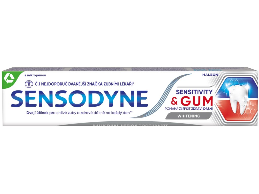 A Sensodyne Sensitivity & Gum Whitening egy olyan fogkrém, amelyet az érzékeny fogak és az íny egészségének mindennapi ápolására terveztek. Az érzékenység elleni védelmet gyengéd fehérítő hatással ötvözi, és segít eltávolítani a bakteriális lepedéket, amely ínyproblémákat okozhat. A speciális formula védőréteget képez a fogak érzékeny területein, és rendszeres használattal segít csökkenteni a hideg, meleg vagy édes ingerekre adott kellemetlen reakciókat.