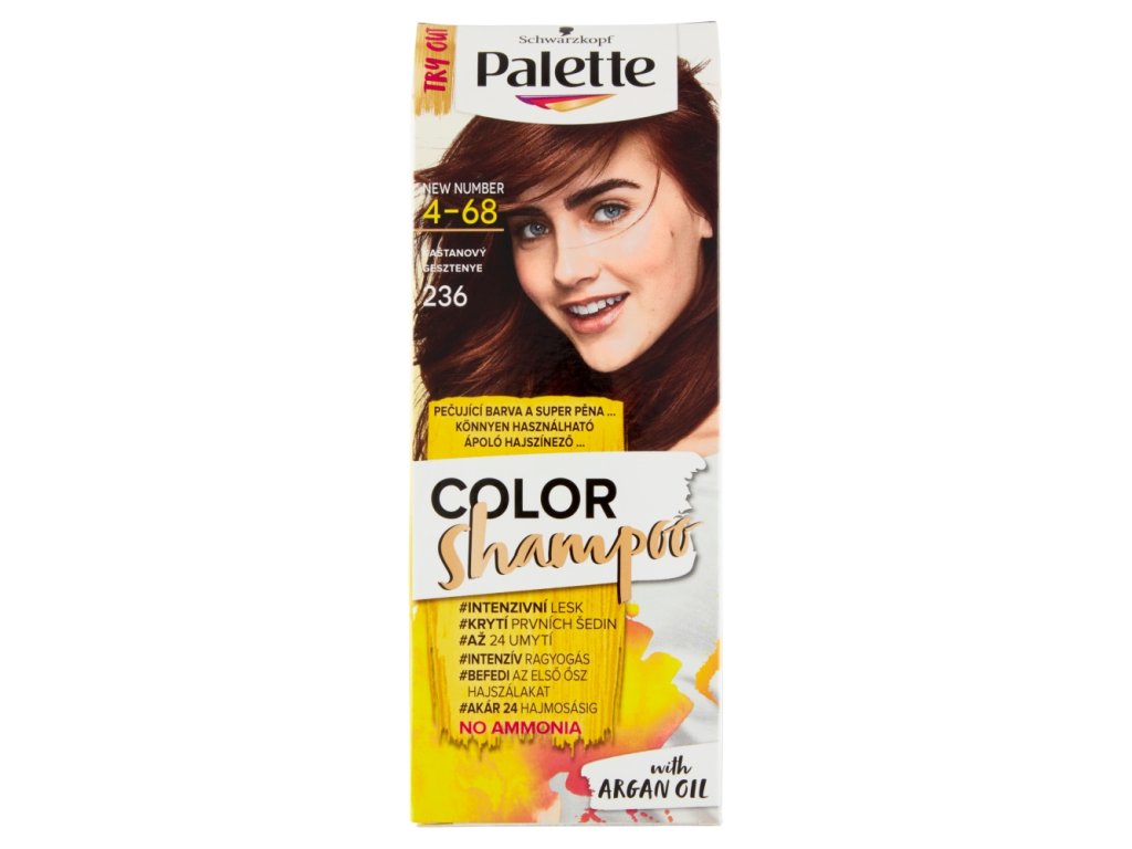 A különleges, ammóniamentes, argánolajjal dúsított formula a festés során a hajgyökértől a hajvégekig ápolja a hajad. A színező krém és az alacsony koncentrációjú fejlesztő egyedülálló kombinációja – a 320, 315, 321, 308, 317 árnyalatok kivételével (3%) – lehetővé teszi, hogy a Palette Color sampon sokkal gyengédebb legyen a többi, koncentráltabb fejlesztőhöz (6% és több) képest. Hasonlóképpen, a formulában található speciális színpigmentek kiváló színeredményt biztosítanak a hajadnak. Az eredmény természetesen kifejező, egészséges kinézetű, fokozott fényű haj.