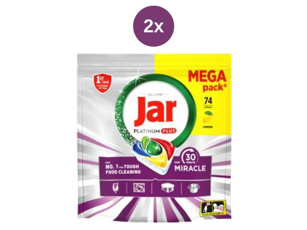 A Jar Platinum Plus Miracle MEGA rendkívül hatékony, többfunkciós mosogatógép-kapszulák, amelyek maximális tisztítóteljesítményt biztosítanak még az erősen szennyezett edényeken is. A 30 perces Miracle technológiának köszönhetően rövid mosási ciklusok alatt, előmosás nélkül is képesek megbirkózni a rászáradt ételmaradékokkal és zsírral.
