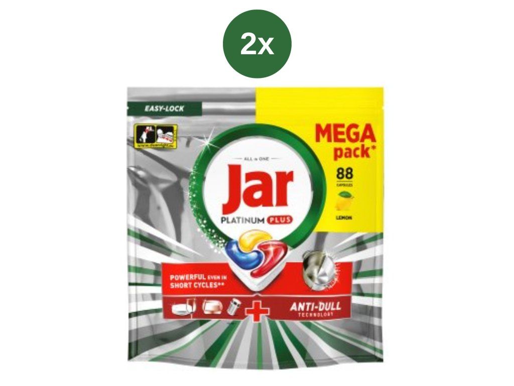 A Jar Platinum Plus MEGA rendkívül hatékony, mindent az egyben mosogatógép-kapszulák, amelyek tökéletes eredményt biztosítanak még az erősen szennyezett edények esetén is. A gél és por állagú összetevők fejlett kombinációjának köszönhetően hatékonyan eltávolítják a zsírt, a rászáradt ételmaradékokat és más makacs szennyeződéseket előmosás nélkül.