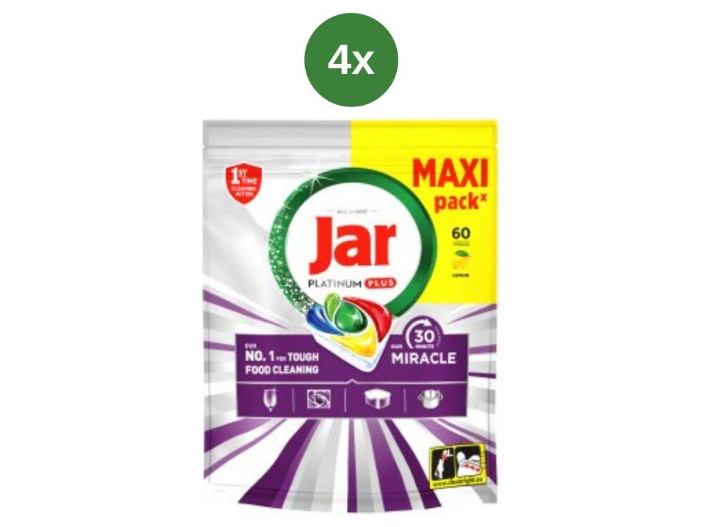 A Jar Platinum Plus Miracle MAXI rendkívül hatékony, mindent az egyben mosogatógép-kapszulák, amelyek tökéletes eredményt biztosítanak még az erősen szennyezett edények esetén is. Fejlett technológiájuknak köszönhetően mindössze egy rövid mosási ciklus alatt, előmosás nélkül eltávolítják a rászáradt ételmaradékokat és zsírt.